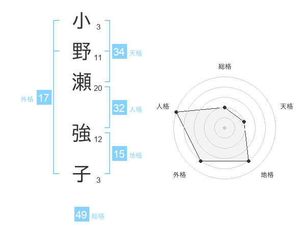 小野瀬 強子さんを姓名の画数から五運を鑑定