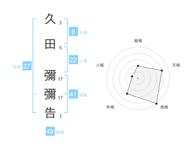 久田 彌彌告さんの総格は49画の2点!