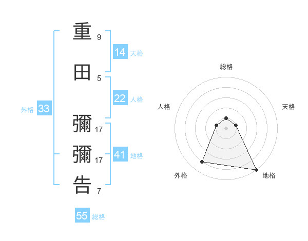 重田 彌彌告さんを姓名の画数から五運を鑑定