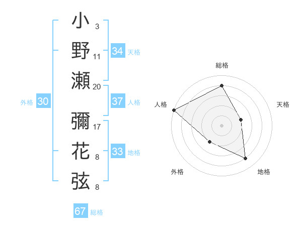 小野瀬 彌花弦さんの総格は67画の4点
