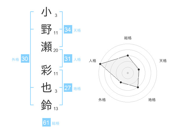 小野瀬 彩也鈴さんの総格は61画の3点!