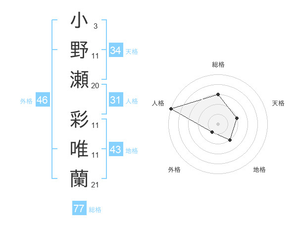 小野瀬 彩唯蘭さんの総格は77画の3点!