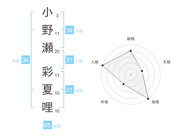 小野瀬 彩夏哩さんの総格は65画の4点!