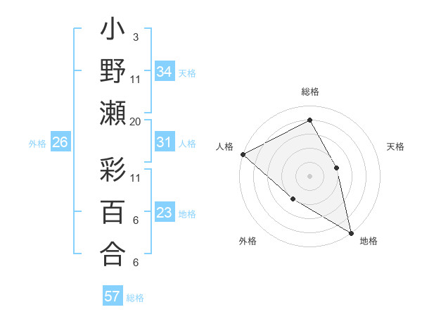 小野瀬 彩百合さんを姓名の画数から五運を鑑定