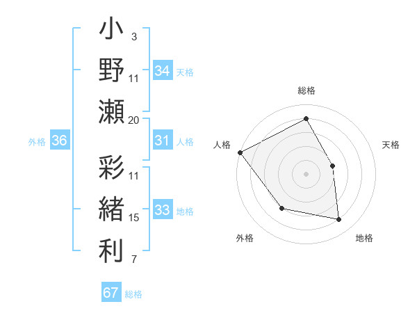 小野瀬 彩緒利さんの総格は67画の4点!