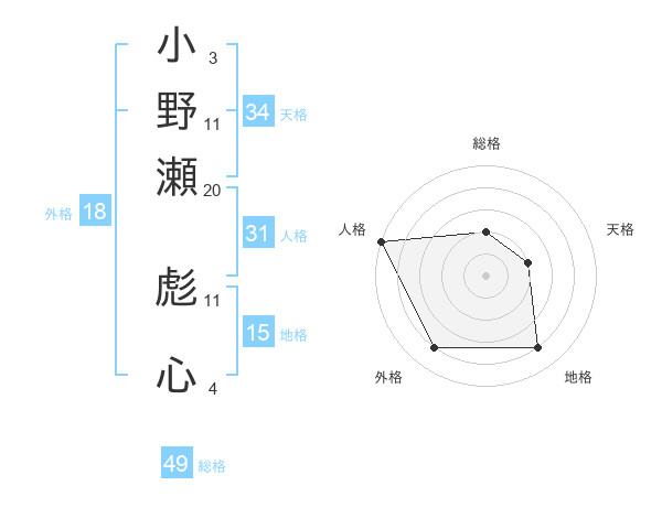 小野瀬 彪心さんを姓名の画数から五運を鑑定