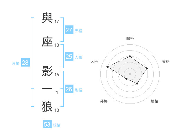 與座 影一狼さんの総格は53画の3点!