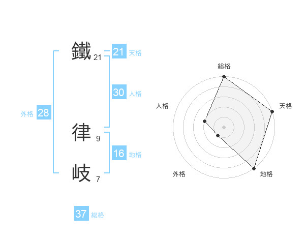 鐵 律岐さんの総格は37画の5点!