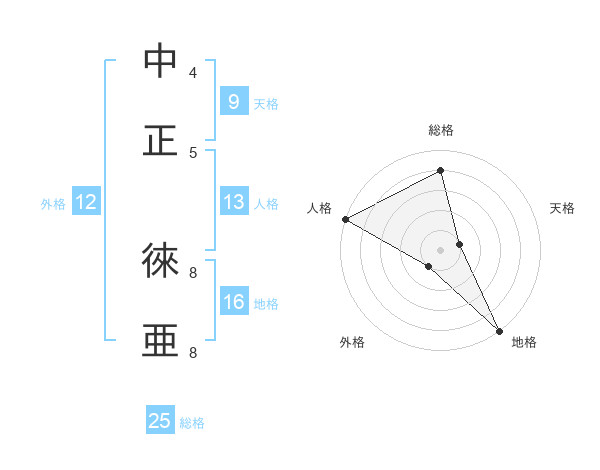 中正 徠亜さんの総格は25画の4点!