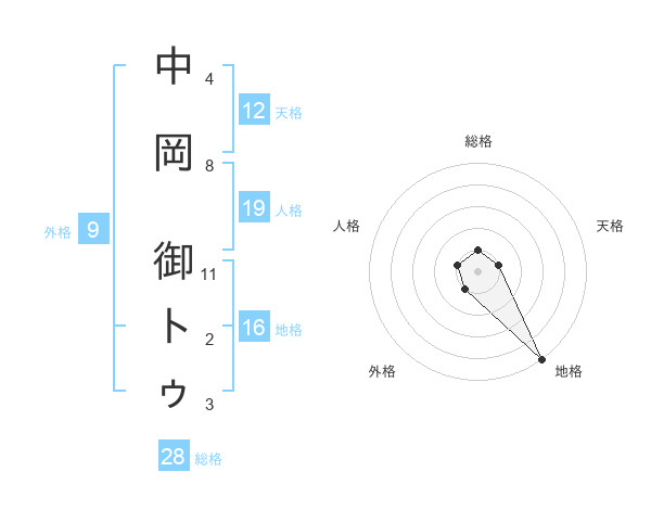 中岡 御トゥさんの総格は28画の1点