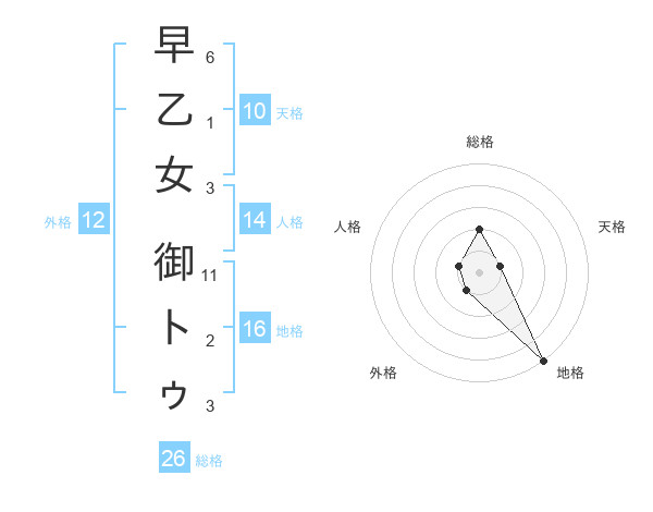 早乙女 御トゥさんを姓名の画数から五運を鑑定