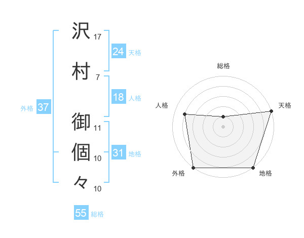 沢村 御個々さんの総格は55画の1点!