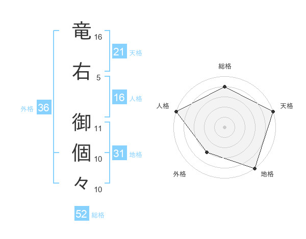 竜右 御個々さんの総格は52画の4点!