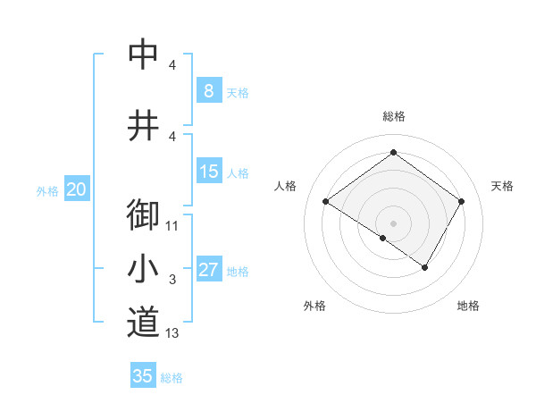 中井 御小道さんの総格は35画の4点!