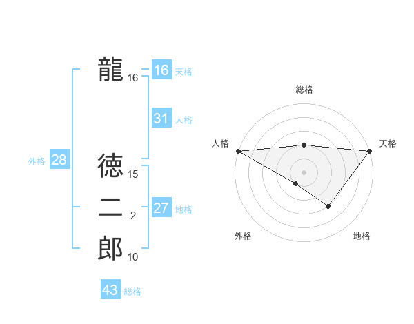 龍 徳二郎さんを姓名の画数から五運を鑑定