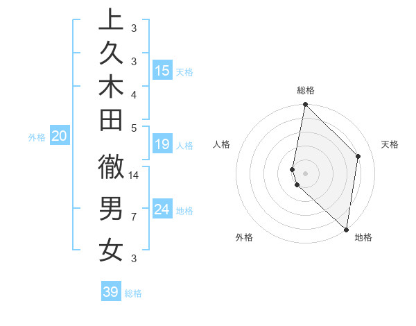 上久木田 徹男女さんの総格は39画の5点!