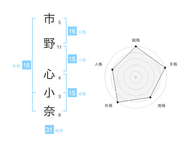 市野 心小奈さんの外格は16画の5点