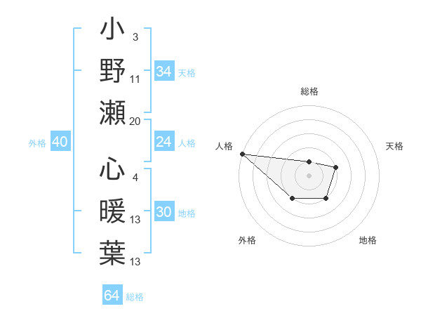 小野瀬 心暖葉さんの総格は64画の1点!