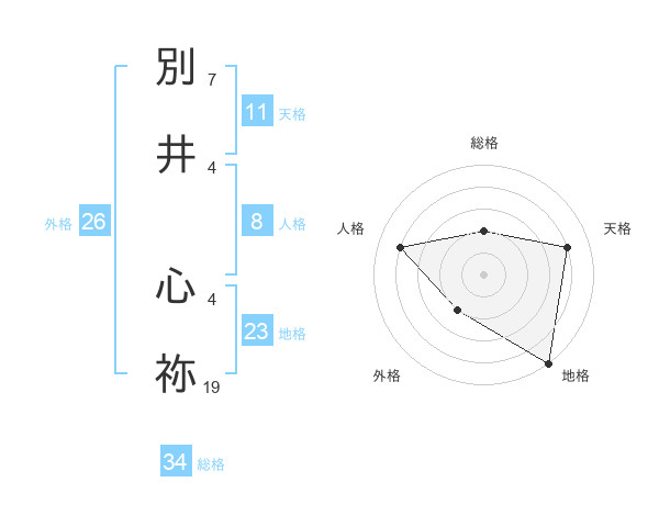 別井 心祢さんの総格は34画の2点!