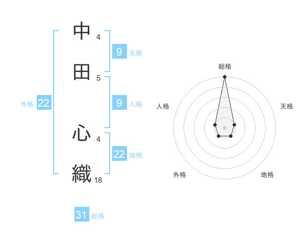 中田 心織さんの総格は31画の5点