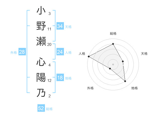 小野瀬 心陽乃さんを姓名の画数から五運を鑑定