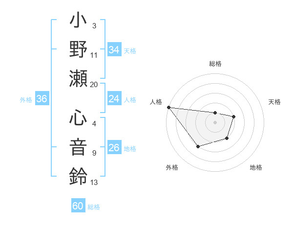 小野瀬 心音鈴さんを姓名の画数から五運を鑑定