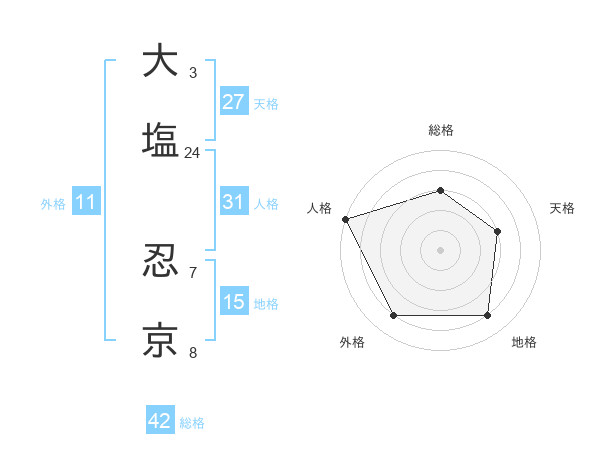 大塩 忍京さんを姓名の画数から五運を鑑定