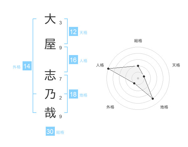 大屋 志乃哉さんの総格は30画の2点!