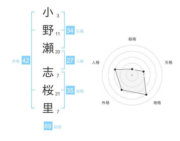 小野瀬 志桜里さんを姓名の画数から五運を鑑定