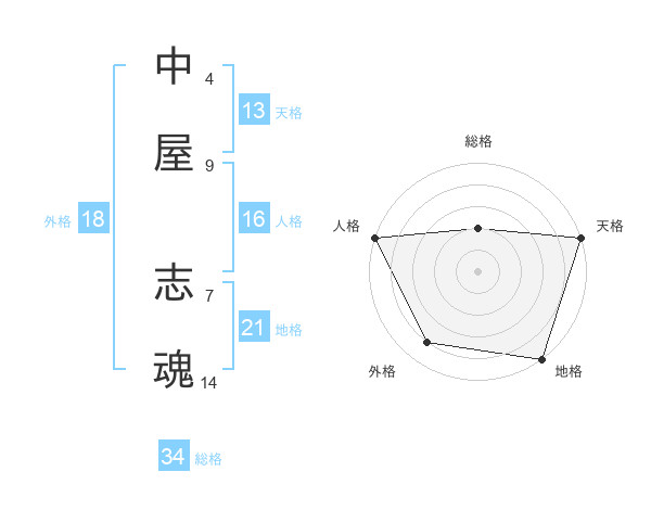 中屋 志魂さんの総格は34画の2点!