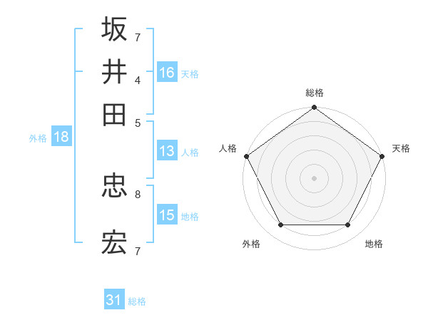 坂井田 忠宏さんの総格は31画の5点!