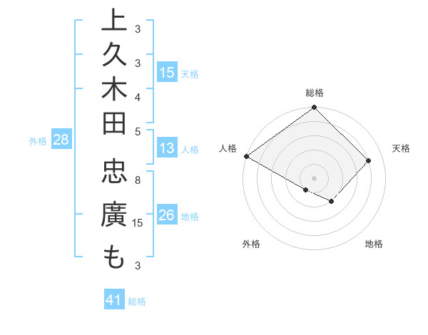 上久木田 忠廣もさんを姓名の画数から五運を鑑定