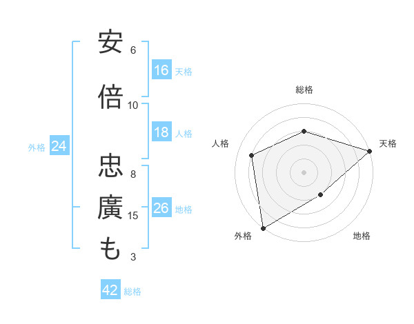 安倍 忠廣もさんを姓名の画数から五運を鑑定