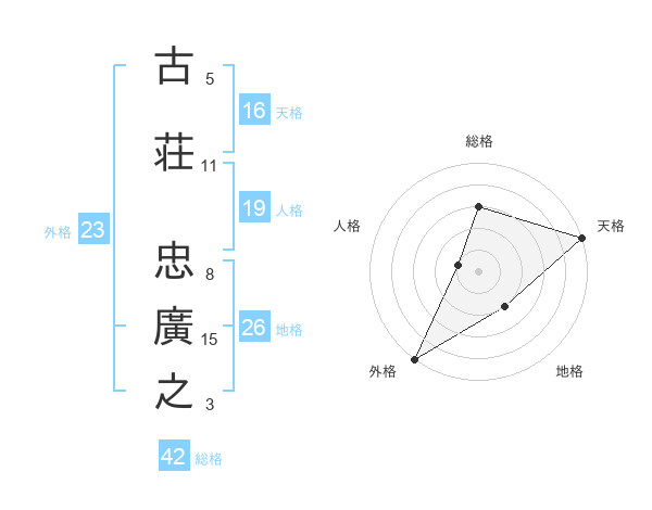 古荘 忠廣之さんを姓名の画数から五運を鑑定