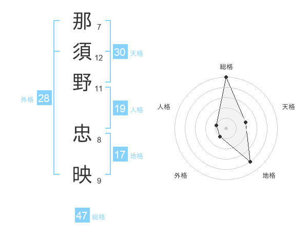 那須野 忠映さんを姓名の画数から五運を鑑定