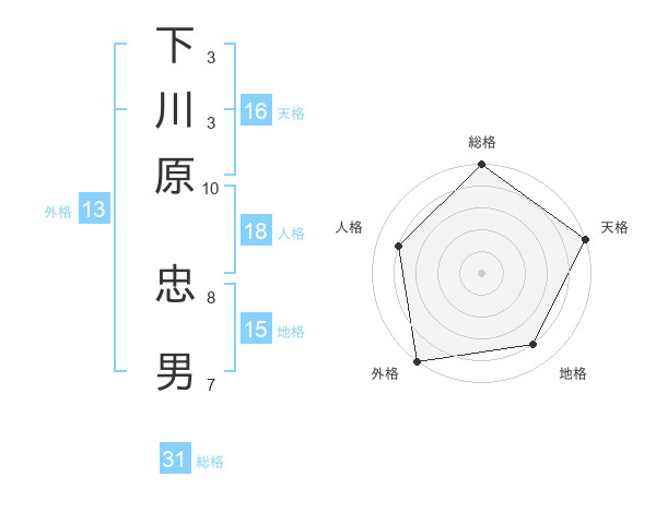 下川原 忠男さんの総格は31画の5点!