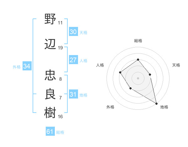 野辺 忠良樹さんの総格は61画の3点!
