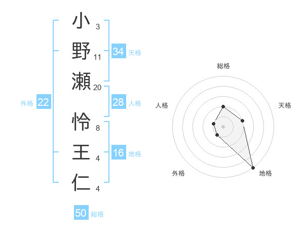 小野瀬 怜王仁さんの総格は50画の2点!