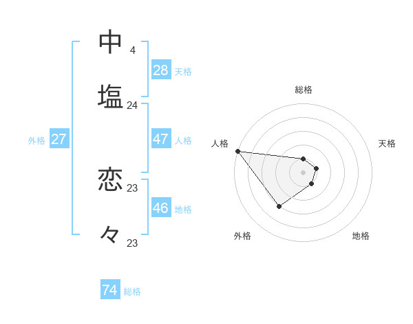 中塩 恋々さんの総格は74画の1点!