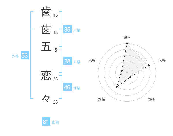 歯歯五 恋々さんの外格は53画の3点!