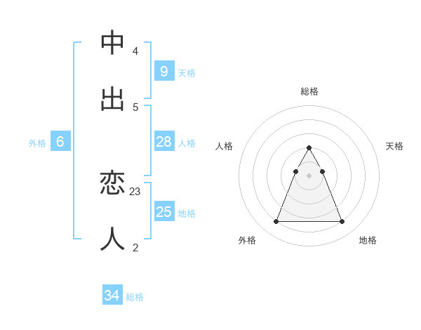 中出 恋人さんの総格は34画の2点!