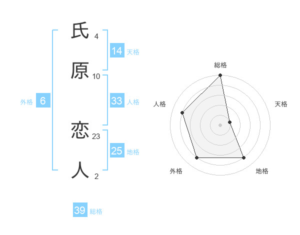 氏原 恋人さんの総格は39画の5点!