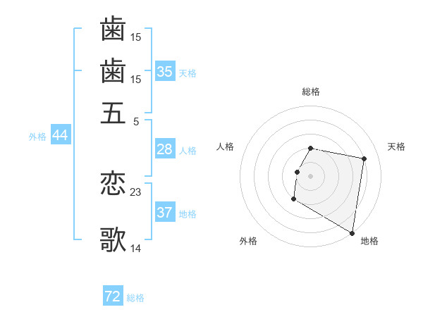 歯歯五 恋歌さんの総格は72画の2点!