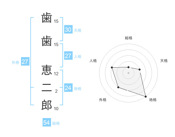 歯歯 恵二郎さんの天格は30画の2点!