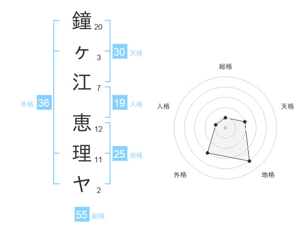 鐘ヶ江 恵理ヤさんの総格は55画の1点!