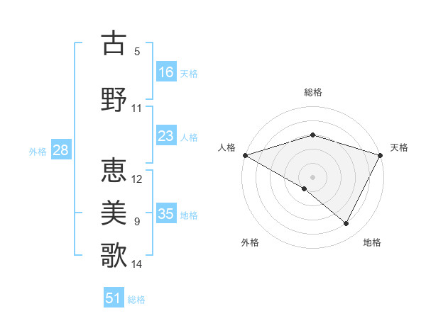 古野 恵美歌さんを姓名の画数から五運を鑑定