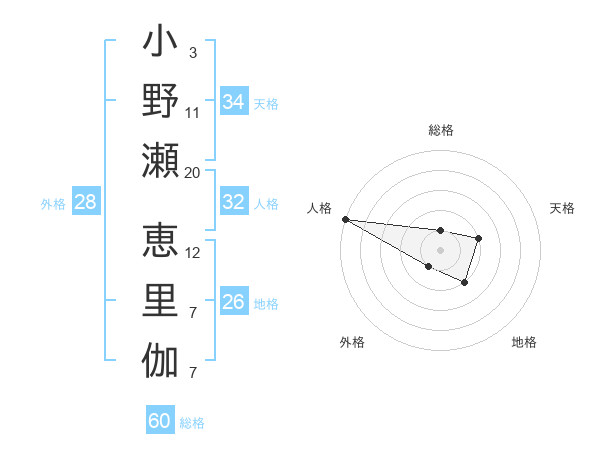 小野瀬 恵里伽さんの総格は60画の1点!