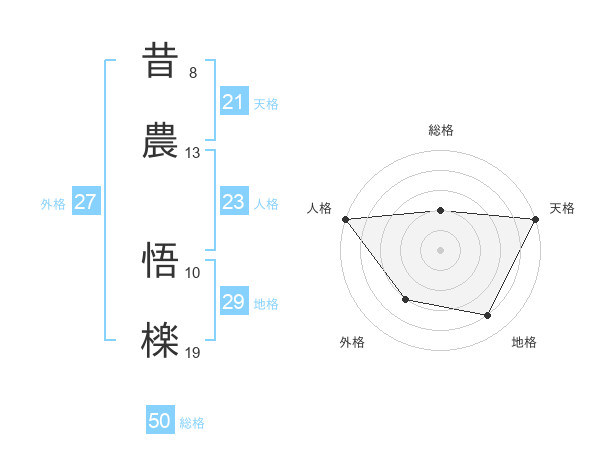 昔農 悟檪さんの総格は50画の2点!