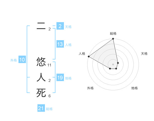 二 悠人死さんの総格は21画の5点!