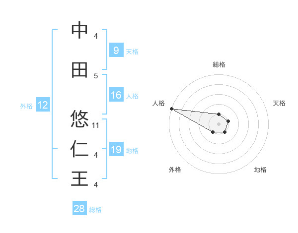 中田 悠仁王さんの総格は28画の1点